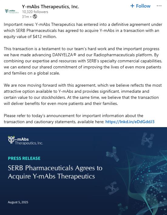 WEST CONSHOHOCKEN, PA and PRINCETON, NJ, August 5, 2025 – SERB Pharmaceuticals (“SERB”), a global specialty pharmaceutical company focused on medicines for rare diseases and medical emergencies, and Y-mAbs Therapeutics, Inc. (Nasdaq: YMAB) (“Y-mAbs” or “the Company”), a commercial-stage biopharmaceutical company focused on the development and commercialization of antibody-based therapeutics for the treatment of cancer, today announced that they have entered into a definitive merger agreement under which SERB will acquire Y-mAbs, including its lead commercial oncology asset, DANYELZA® (naxitamab-gqgk), in an all-cash transaction, representing an equity value for Y-mAbs of approximately $412 million.